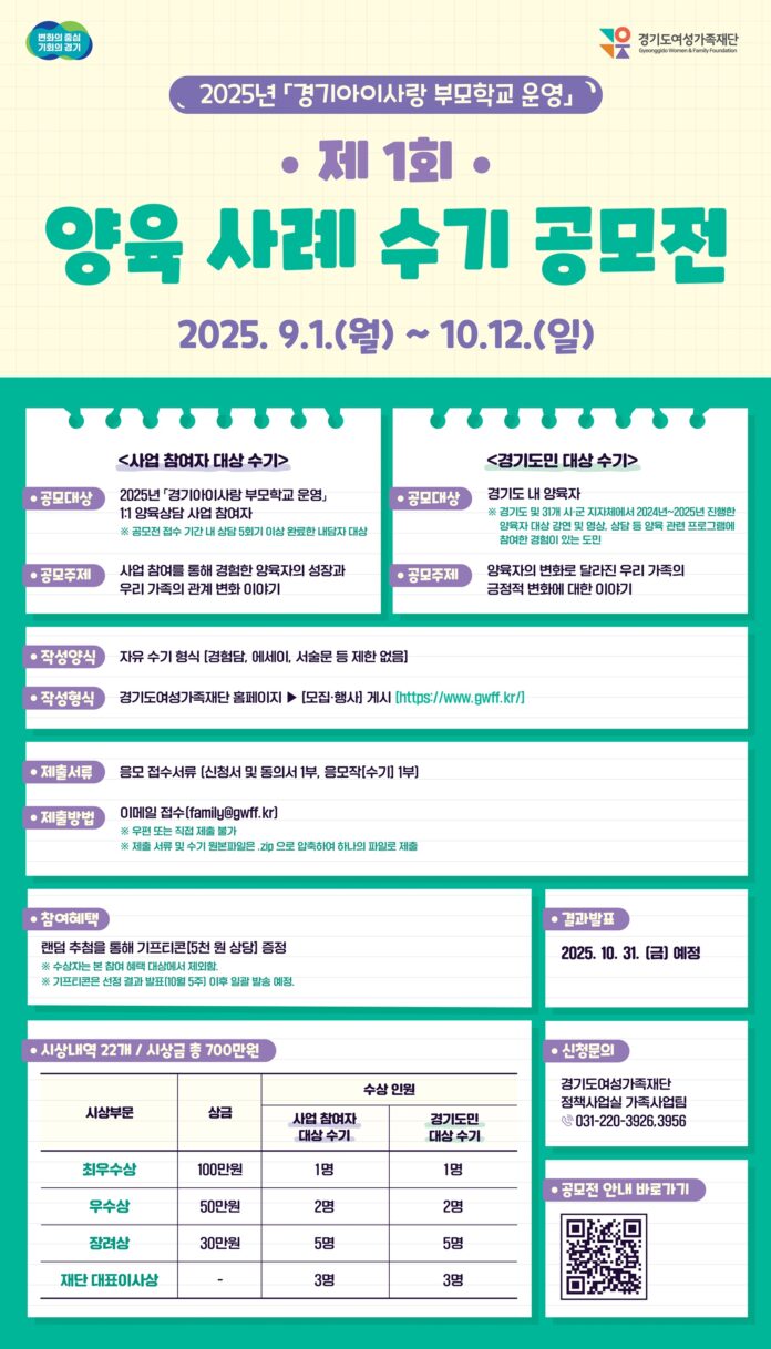 공모전은 ‘2025년 경기아이사랑부모학교 운영사업’의 하나로 마련됐다. ‘경기아이사랑 부모학교 운영’은 양육에 관심 있는 도민을 대상으로 1:1 양육 상담과 맞춤형 교육을 제공하는 사업이다.