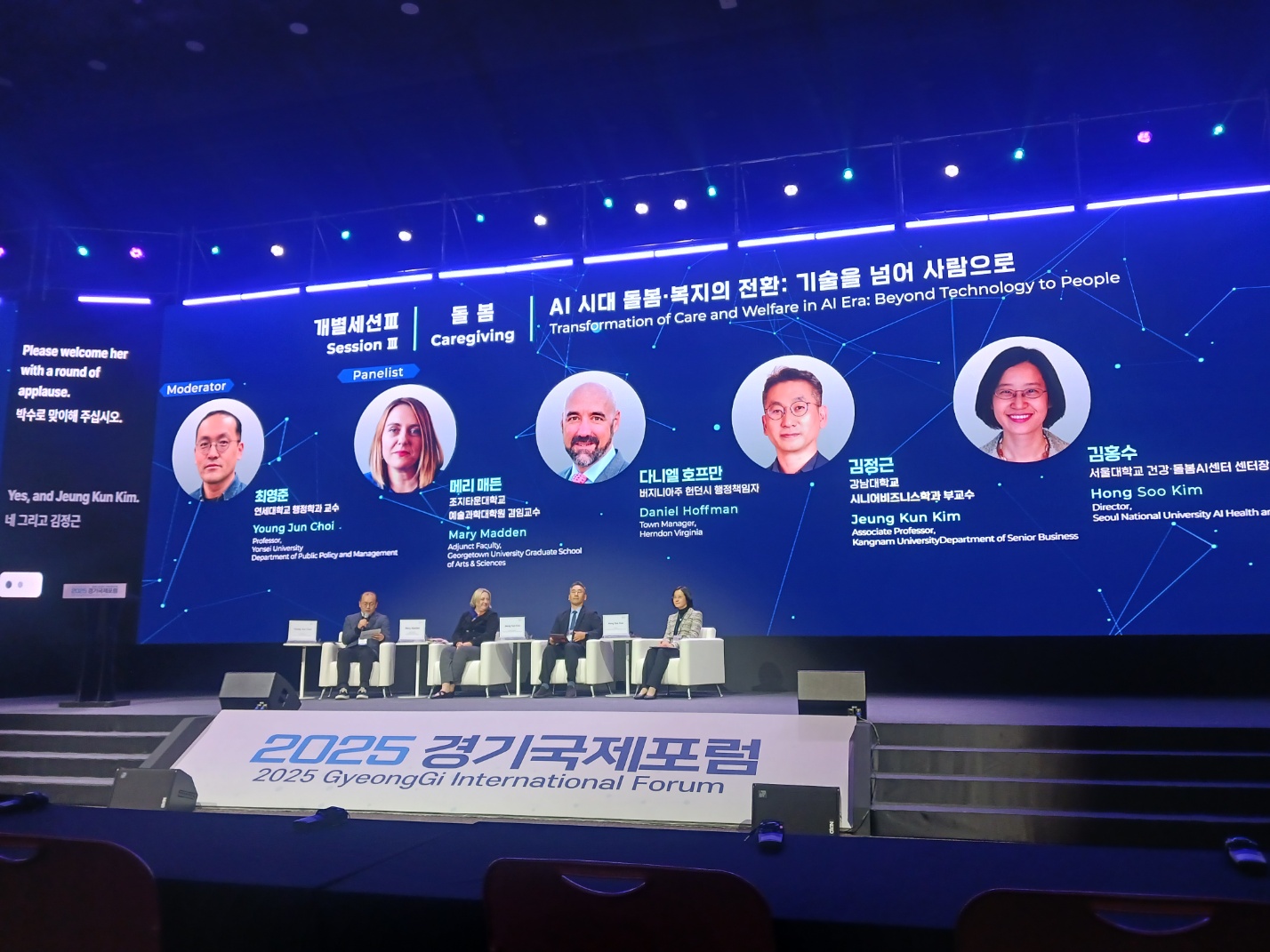 ‘AI 시대 돌봄ㆍ복지의 전환: 기술을 넘어 사람으로(Tranformation of CareWelfare in AI Era: Beyond Technology to People)’라는 주제로 조지타운대학교 예술과학대학원 매리매든 네스퍼 겸임교수, 다니엘 호프만 미국 버지니아주 헌든시 행정책임자, 김정근 강남대학교 시니어비즈니스학과 부교수, 김홍수 서울대학교 건강ㆍ돌봄AI센터 센터장이 연사로 나와 인간 중심 복지사회를 위한 인공지능 기술과 쟁점, 인공지능 기술 개발 및 구현 시 윤리적 고려사항과 책임성에 대해 열띤 토론을 펼쳤다.